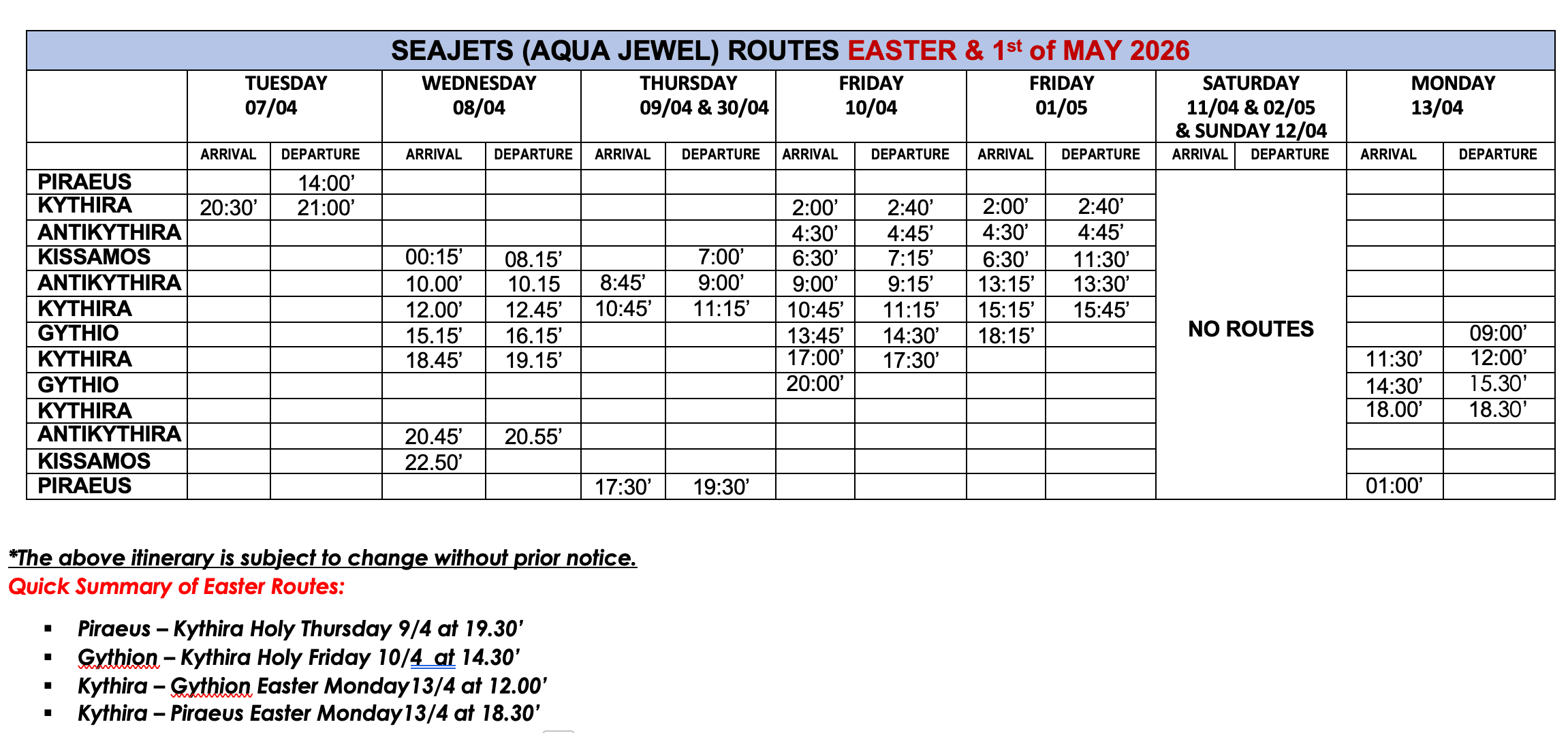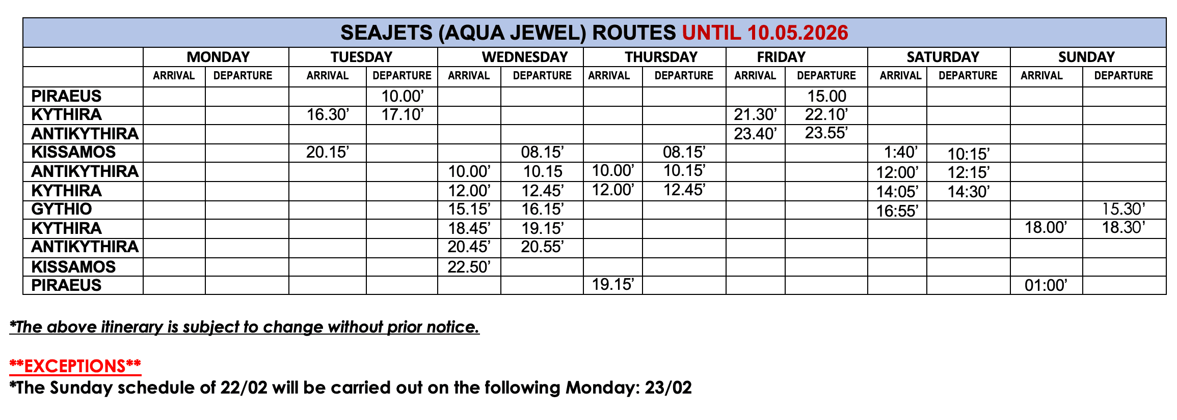 Schedules from Piraeus to Kythera – Antikythera – Kissamos – Gythio with “AQUA JEWEL” Ferry