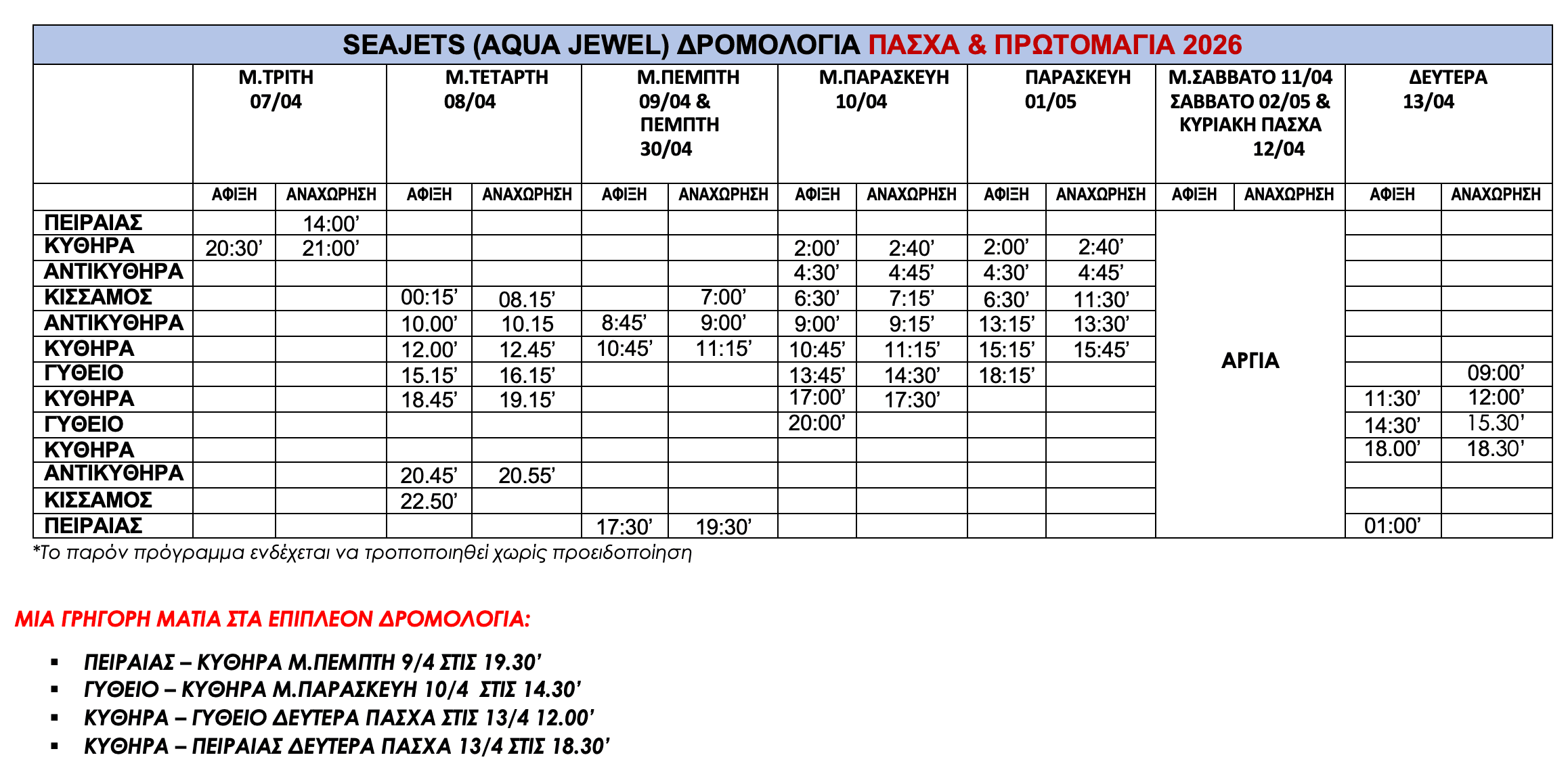 Το πρόγραμμα δρομολογίων υπόκειται σε αλλαγές χωρίς προηγούμενη ειδοποίηση.