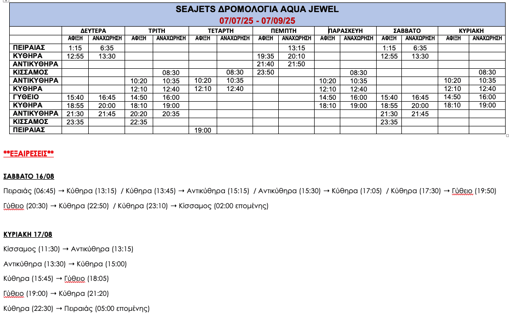 Δρομολόγια από Πειραιά προς Κύθηρα – Αντικύθηρα – Κίσσαμο – Γύθειο με το πλοίο “AQUA JEWEL”